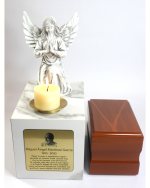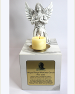 «Este monumento cenizario es ideal para convertir tu hogar en el lugar de descanso final de ese ser amado que partió a la eternidad. Incluye una urna en cuarzo, una estatua de ángel en oración, un portavelas y una placa dorada personalizada con su rostro, nombre, fechas y una dedicatoria especial. Un tributo lleno de amor, luz y recuerdo eterno.