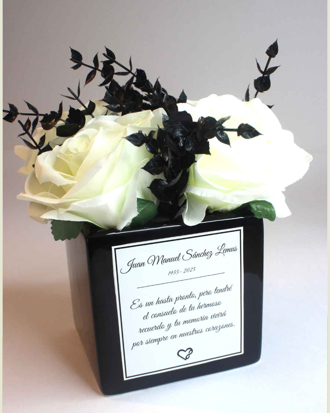 Arreglo con rosas blancas artificiales sobre una base negra brillante en ceramica se personaliza la marcacion con nombre, fechas y frase memorial.