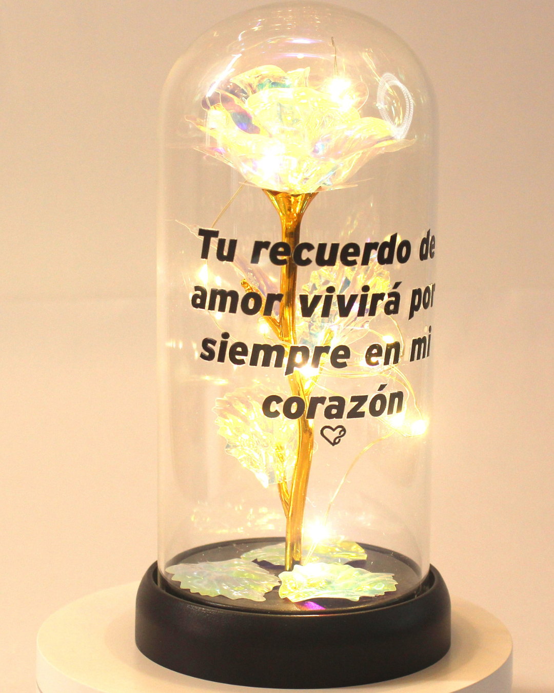 Con esta hermosa rosa de pétalos acabados en diamante, tallo metálico dorado, cúpula de vidrio e iluminación interna, acompañada de un emotivo mensaje de despedida, podrás encontrar consuelo y apaciguar el alma en el dolor de un duelo.