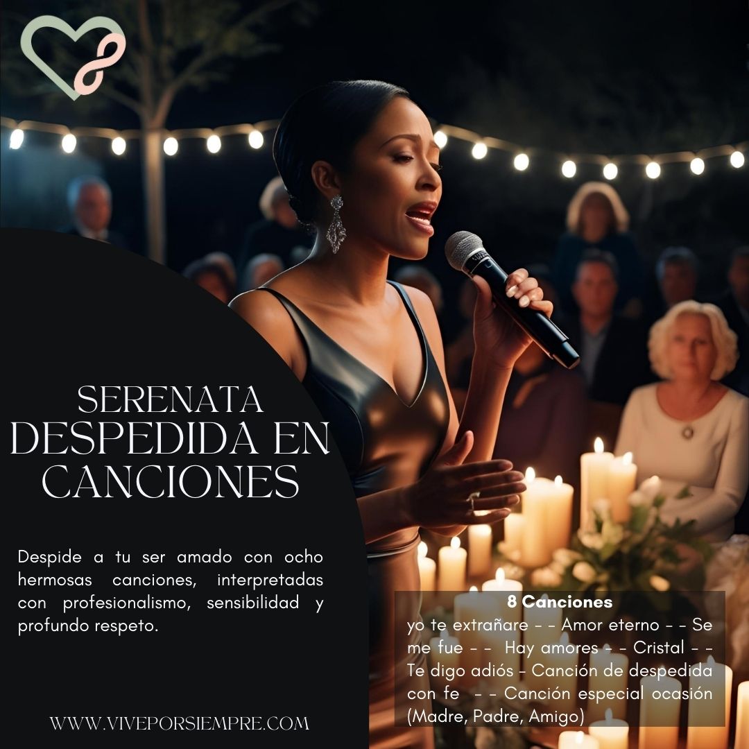 Despide a tu ser querido con canciones que toquen el alma. Te ofrecemos la mejor propuesta de serenata de despedida, con un repertorio de canciones profundamente emotivas. De la mano de nuestras cantantes profesionales, recibirás consuelo en este momento tan difícil y podrás rendir un último homenaje a la vida de tu ser amado. Nuestro servicio incluye una cantante profesional interpretando 8 hermosas canciones, la lectura de un poema de despedida y la entrega de un pin de duelo como recuerdo.